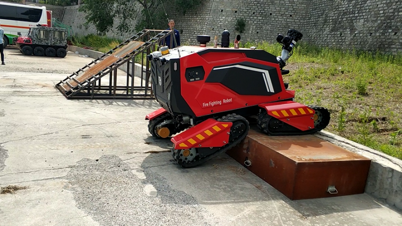 在驗收現場,根據山東消防救援(yuán)總隊提出的驗收標準,與(yǔ)同行競品分別進行了垂直越障、S型行走、45度爬坡、單邊橋行進、拖拉水帶行走、射水距離、夜間盲操等(děng)性能測試。